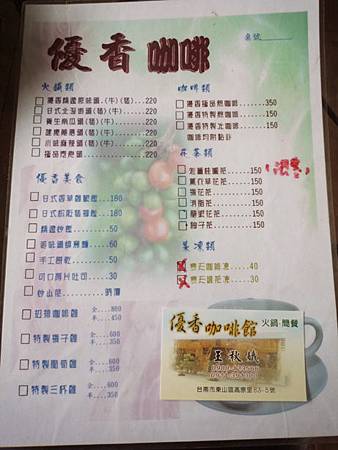 優香咖啡館也有提供餐點,店裡有火鍋、簡餐、咖啡、特別是火鍋它裡面菜色以衆不同、當地的野菜如龍鬚菜、過貓、野川七、山蘇、南瓜等